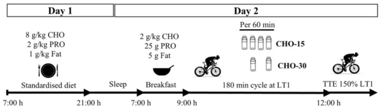 Jones et al. (2025). Schematic of study protocol for each condition, where participants followed a standardised high CHO diet for 24 h prior to completing a 180 min steady state cycling protocol followed by an exercise capacity test.