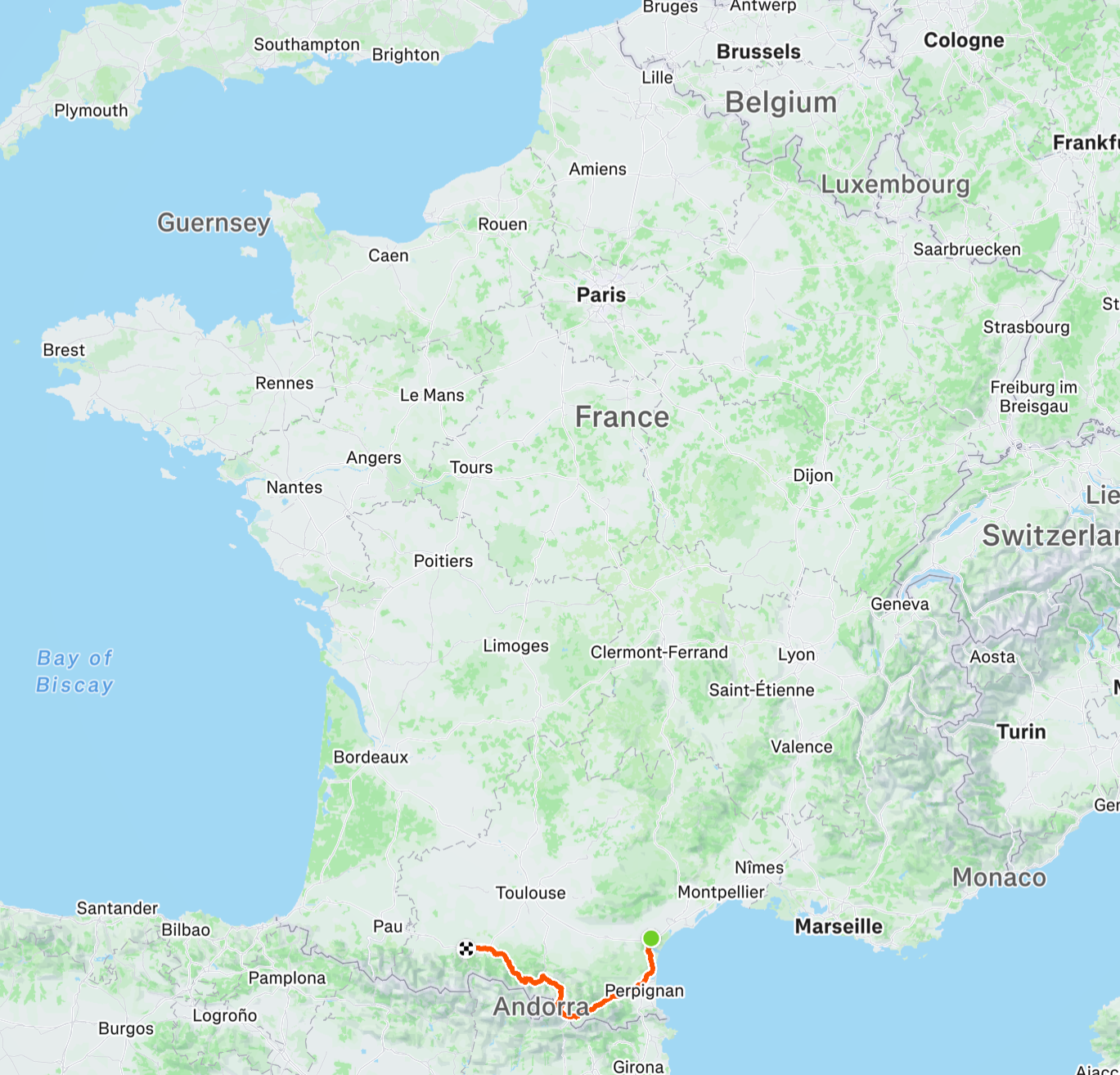 The long descent to Ax-les-Thermes followed and just after at Savignac-les-Ormeaux I pulled into an Intermarché for a feeding that would take just over half an hour, including (in a fine example of multitasking) the recording of this voice note recapping the morning’s action and previewing what was to come:
